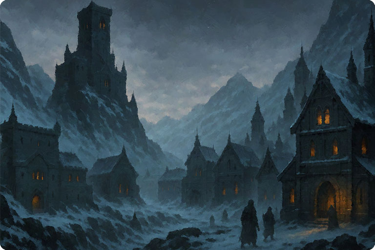 Город в заснеженных горах, температура редко поднимается выше нуля. Постройки из черного камня, украшенные резьбой.